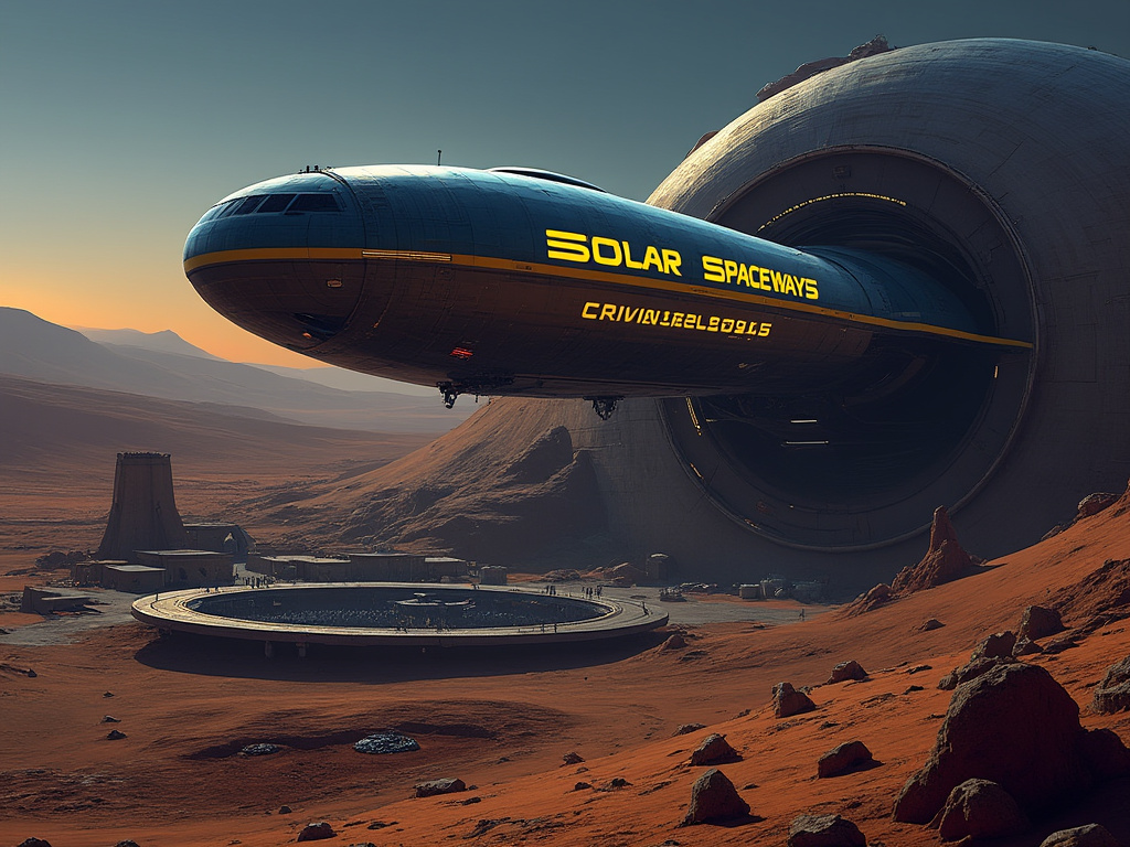In year 2352 a cone shaped transport hovered into position outside the domed city of Powlett, Mars. On opposite sides of the vessel ‘Solar Spaceways Cruise Coach’ flashed in bold, yellow letters. Hanging in the thin air, it sprouted a disembarking tube to connect to the round, sealed dock. Outside the dome was a typical Martian landscape with rocks and dust to the horizon, and a faint blue sunset decorated the dark sky. Inside Powlett there was not much more to see. The single-story buildings were made of stone, and the only sign of life was a crowd of people loitering near the circular hatch.